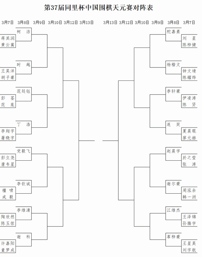 1、参加本选赛的选手:除种子棋手外根据等级分顺序取31人,国家围棋队选拔产生1名女棋手,共计32名棋手,进行一轮单败淘汰赛,取16名棋手进入本赛。